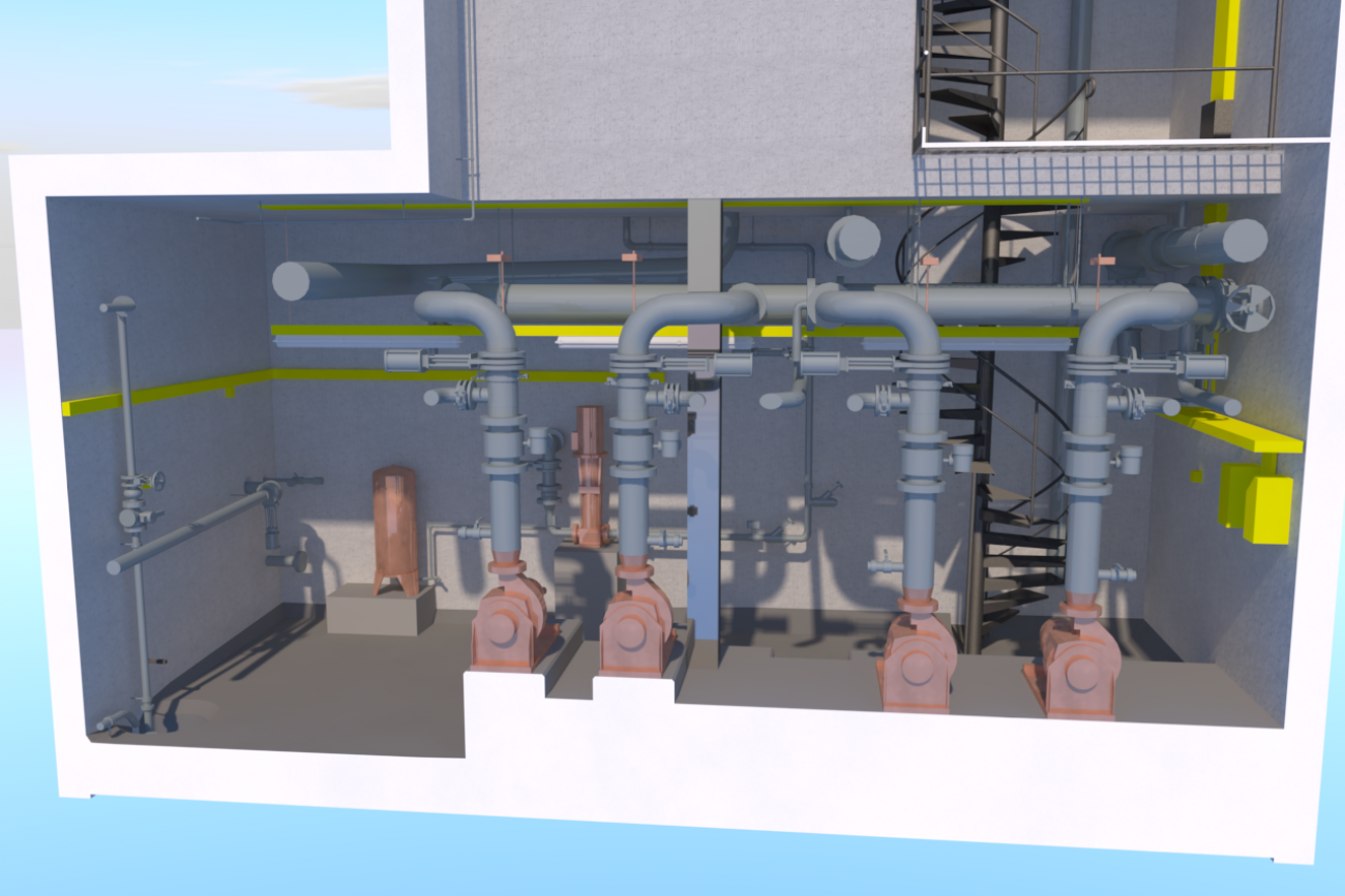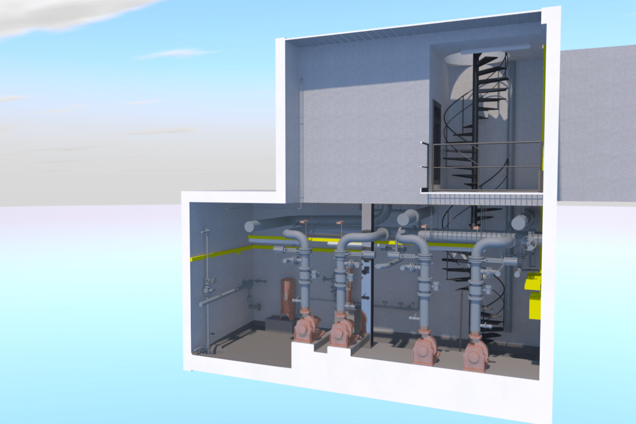 Pumping station modeling project was divided into two constructional parts. The architectural component of the building was made using the ArchiCAD (LOD 300), engineering MEP — part is implemented in Autodesk Revit (LOD 250).