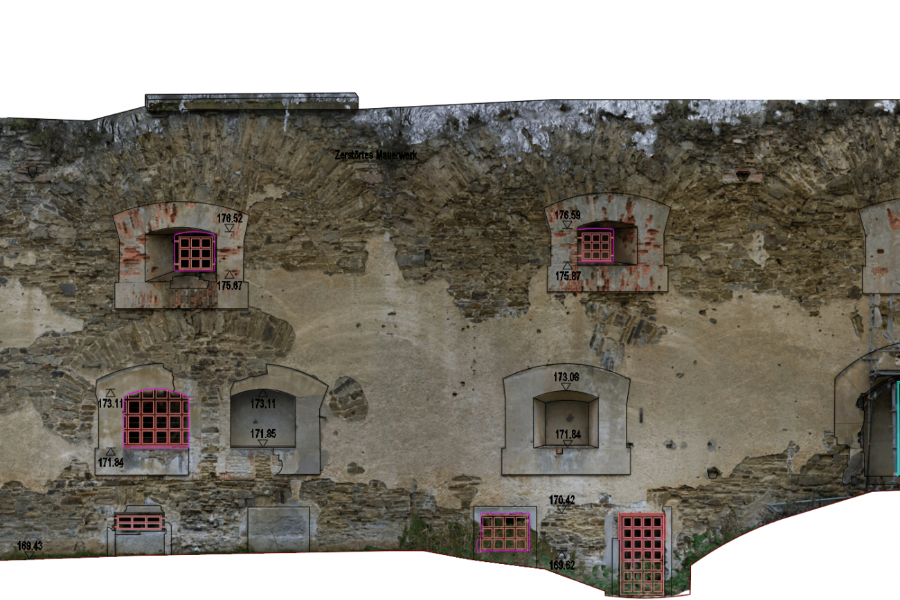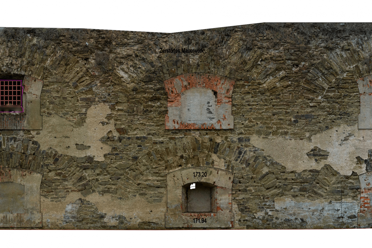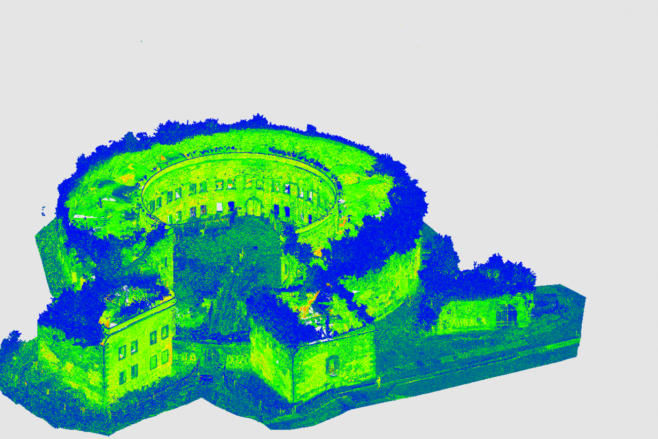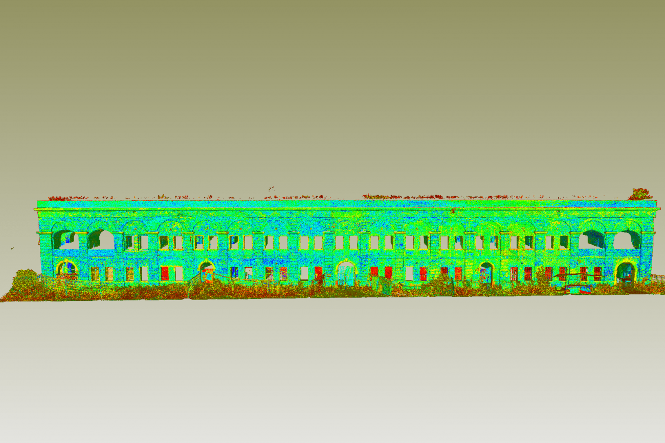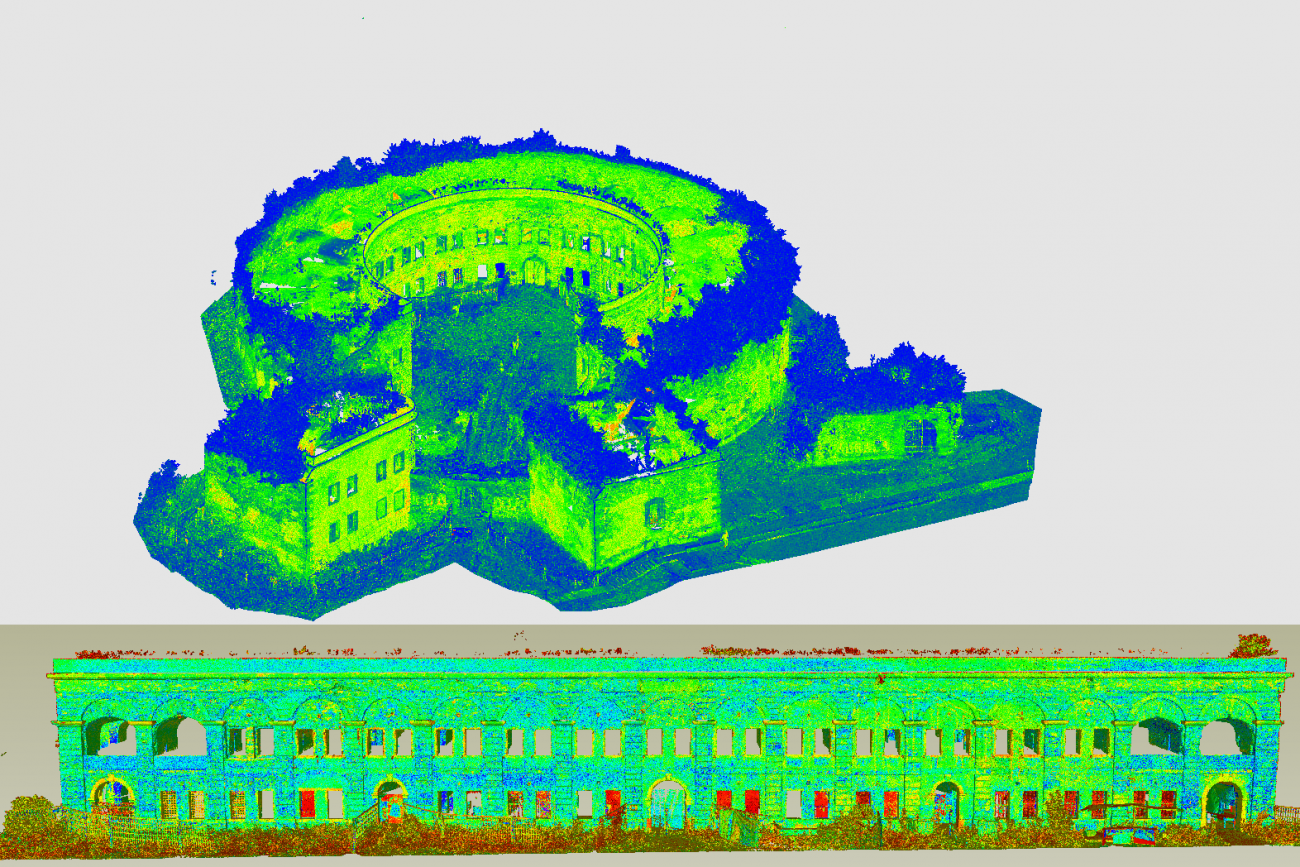 The main task of this project was to obtain the unrolled 2D drawings and orthophoto generation of the fort’s facades with maximum details, allowing to investigate the damages of the Reduit structures.